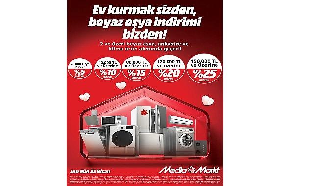 MediaMarkt Türkiye, yeni evlenecekler ve evini yenileyecekler için Evlilik Kampanyası başlattı. Kampanya kapsamında, 22 Nisan tarihine kadar MediaMarkt mağazaları, mediamarkt.com.tr ve Mediamarkt mobil uygulamasında seçili Beyaz eşya ve ankastre ürünlerinden yapılacak 2 ve üzeri alımlarda yüzde 25’e varan indirim fırsatları sunuluyor. Geniş ürün yelpazesiyle tüketicilere konforlu alışveriş keyfi sunan MediaMarkt Türkiye, yeni evlenecekler ve beyaz eşyalarını yenilemek isteyenler için Evlilik Kampanyası başlattı. 22 Nisan’a kadar devam edecek Evlilik Kampanyası ile seçili son teknoloji beyaz eşya ve ankastre ürünler, kampanya koşulları dahilinde yüzde 5 ile yüzde 25 arasında değişen oranlarda indirimlerle tüketicilerle buluşuyor. Beyaz Eşya ve ankastre ürünlerinden tek seferde 2 ve üzeri ürün alışverişinde geçerli olan Evlilik Kampanyası kapsamında;