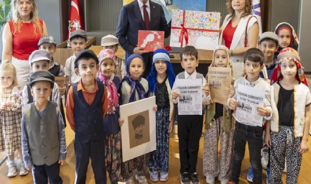 MERSİN (İGFA) - Dr. Kamil Tarhan İlkokulu öğrencileri, Türkiye Belediyeler Birliği (TBB) Başkan Vekili ve Mersin Büyükşehir Belediye Başkanı Vahap Seçer’i ziyaret etti. Cumhuriyet Bayramı dolayısıyla gerçekleşen ziyarette, öğrenciler hem renkli hem de duygusal anlara imza attı. Yöresel ve dönemsel kıyafetlerle Mersin Büyükşehir Belediyesi Hizmet Binası’na gelen minik öğrenciler, ellerinde Atatürk posterleri ve temsili gazete nüshalarıyla ‘Yazıyor, yazıyor! Cumhuriyet ilan edildi!’ nidaları eşliğinde binaya giriş yaptı. Büyük bir coşkuyla Cumhuriyet’in ilanını anımsatan öğrenciler, kendi hazırladıkları ‘Cumhuriyet ilan edildi’ temalı nostaljik gazeteleri belediye personeli ile paylaştı. Minikler, ziyaretin sonunda Başkan Seçer’e de içeriğini kendi hazırlamış oldukları gazeteyi takdim etti. Öte yandan veliler ise atıl durumdaki bir pankartı yeniden düzenleyip, üzerine “Cumhuriyeti Biz Böyle Kazandık” yazısını ekleyerek görüşmeye katıldı. Başkan Seçer, öğrencilerin bu anlamlı jestinden duyduğu memnuniyeti dile getirerek, onların Cumhuriyet coşkusunu ve Atatürk sevgisini yürekten kutladı. Minik öğrencilere, “Cumhuriyet dediğimizde aklınıza ne geliyor?” sorusunu yönelten Seçer, öğrencilerden “Cumhuriyet demek biz demek ve Atatürk aklımıza geliyor” yanıtlarını aldı.